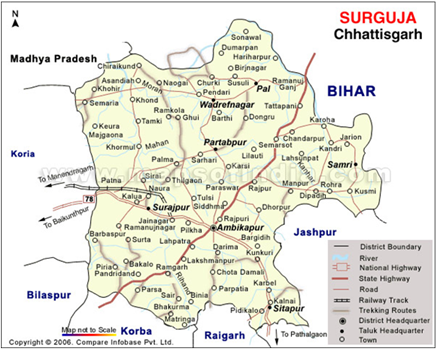 Surguja district is located in the northern part of Chhattisgarh. The district is surrounded by the borders of Uttar Pradesh, Jharkhand, Orissa and Madhya Pradesh states. This district has over extension between south-eastern parts of Vindhyachal-Baghelkhand region of peninsular India.